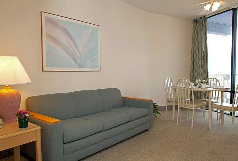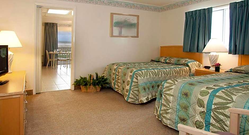 Location is wonderful for families. Right across the street from a playground with splash pad, bike rental, and the beach. It is about a 15 minute walk to the boardwalk and tram. The pool is also wonderful for kids and babies. We used the grill too, which was a nice plus! The kitchenette is very functional and a good way to save money when traveling. It had a fridge, sink, toaster, two electric burners on the stovetop, and a microwave. There was also a coffee machine but we didn’t use it since we got the free coffee downstairs every day. Kitchenette also has all the pots, pans, plates, utensils, etc you will need for vacation. The staff were very attentive also, and very friendly.