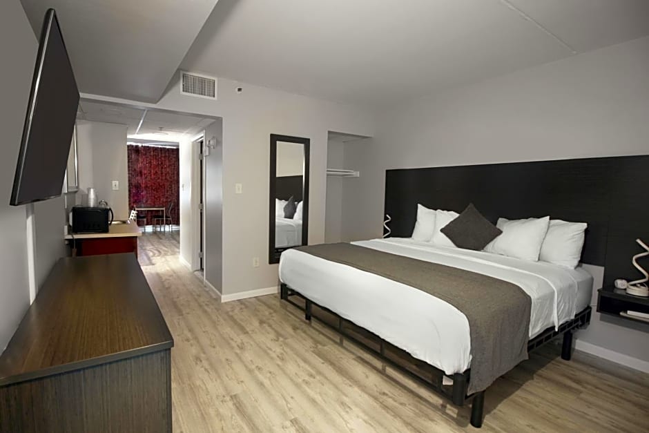 Located in the three-story motel section of the resort, this suite offers a kitchenette, bedroom with 2 double beds, bathroom, living room with sofa bed, microwave, small refrigerator and two TVs. Guests in this room will have views of the pool and oak avenue. Elevator access is not available for this room.