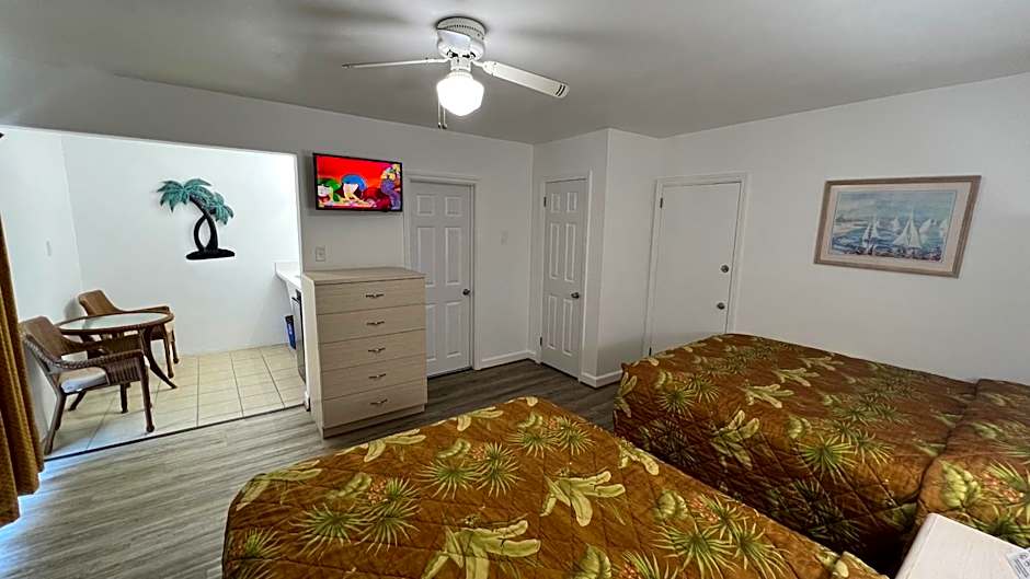 This apartment features a seating area with sleeper sofa, a small refrigerator, microwave, coffee making facilities and 2 flat-screen TVs.