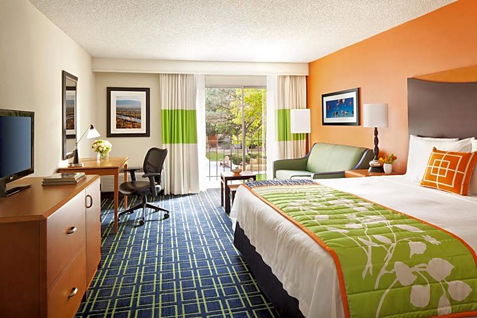 Location is right off the freeway so if your room is facing it, you'll hear the noise. Luckily heater stayed on and muffled the noise. It was nice to be able to open the balcony door to allow fresh air in when it got stuffy. Room (1 king bed) was clean and spacious with a sitting area and beds were very comfortable. Elevator and luggage cart made it easy to bring all my stuff up in one trip. Ice machine on each floor. Traveled alone and felt safe with security constantly present. Room was cleaned daily (stayed 4 nights). Everyone I encountered was very pleasant and accommodating. Close drive to Old Town and if you drive East on Menaul, you'll find lots of restaurants but it's not a pretty area and just a couple of restaurants in walking distance, which I may not feel safe doing alone. But I would definitely stay here again.