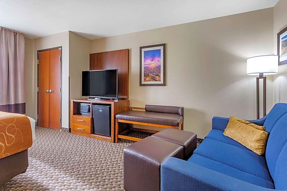 The Comfort Suites Hobbs offers a variety of rooms including Standard Queen Suites, Efficiency King Suites, King Suites, and Queen Suites with Two Queen Beds. All rooms are non-smoking and have an average size of 355-388 sqft. The rooms can accommodate between 4-6 adults and 3-4 children, with bed options including queen size beds, king size beds, and sofa beds.