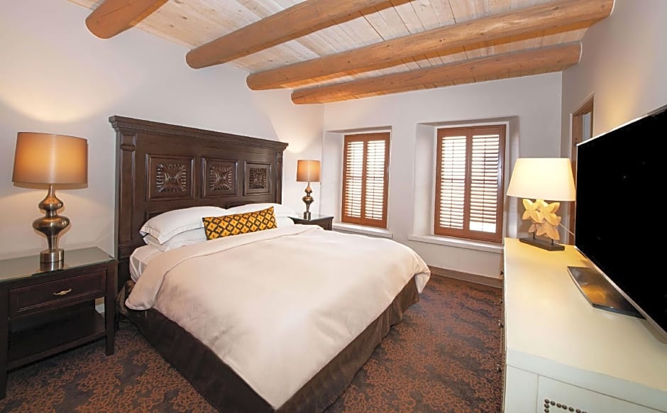 Historic, pool access, seating area, 42-inch TV, work desk, refrigerator, WiFi. Step out to the pool from the comfort of your room. Soft pillows rest upon bedding draped with a plush comforter, and 250 hundred thread count linen. Sleep in the perfect comfort of our hotel suitably located in the heart of the country's third largest art market & quaint city of Santa Fe. Awake to the color and style of the city's famed Historic Plaza surrounded by art, culture, history & traditions. Indulge in the personal amenities and detailed touches of our stylish oversized bathrooms. Discover the convenience of a work desk complimented with wireless technology, and relax in our high-back lounge seating and accompanying ottoman. Other amenities include refrigerators, 42-inch flat-screen TV, soaking tubs & luxury bath amenities, gourmet coffee & tea service.