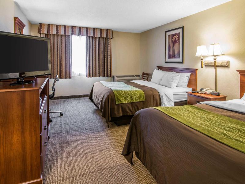 The Comfort Inn City of Natural Lakes offers King Rooms and Queen Rooms with Two Queen Beds. The rooms are non-smoking and some are pet friendly. The King Rooms accommodate 2 adults and 1 child, while the Queen Rooms accommodate 4 adults and 3 children. The bed sizes vary between rooms, with options of a King size bed or two Queen size beds. The room sizes are 280 square feet.