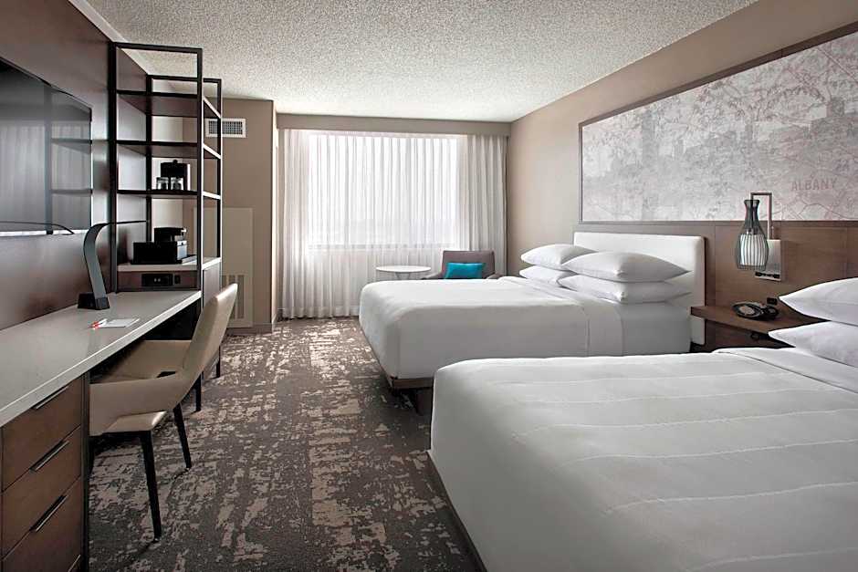 There are two types of rooms available at Marriott Albany hotel. The first is the King or Double Room which has a room size of 355 sqft, does not allow smoking, and can accommodate 4 adults and 3 children. It has 1 Double bed and 1 King size bed. The second is the Queen Room with Two Queen Beds, which also has a room size of 355 sqft, does not allow smoking, and can accommodate 4 adults and 3 children. It has 2 Queen size beds.