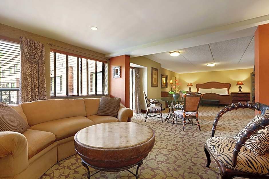 Living area, open floor layout, microwave, refrigerator, classic style decor This studio-style junior suite on the second floor offers a living area with sofa and chair. Watch TV on two 37-inch flat-screens located in the bedroom and living area. There are two closets in the living room area and in the bathroom. Enjoy the deluxe stand up shower with heated lamps and double sinks. Make use of the large kitchen, which includes a microwave, full-sized refrigerator (no stove) and Keurig® coffeemaker. Catch up on work at the large work desk with ergonomic chair and keep in touch with complimentary WiFi. Experience a comfortable night's sleep in the king-sized Serta Perfect Sleeper bed.