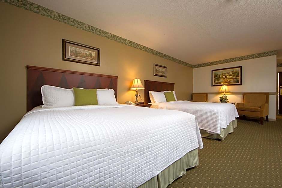 This room features two double or two queen beds and a small sitting area. The bathroom has a bathtub and shower combination.