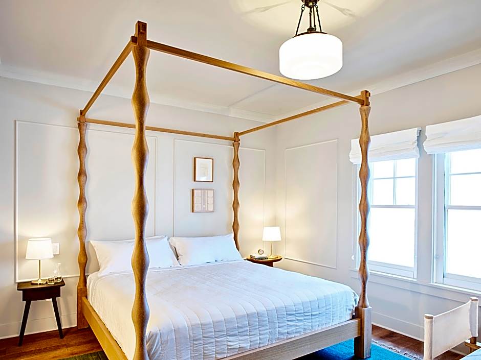 Unwind and relax in this town view welcoming room featuring two custom designed, four poster queen sized beds with 350 thread count linens for a cozy night’s sleep, a large wardrobe with a built-in full-length mirror, hard wood floors with beautiful area rugs, and a gorgeous bathroom which exhibits unlacquered brass fixtures, and a walk-in shower with glass doors. Pamper yourself with custom blended toiletries by American Medicinal Art's Born Bathing line and enjoy the robe and slippers that are also provided to maximize your comfort. You can also unwind in front of the 55-inch 4K HDTV with Sonifi and complimentary HBO. Other conveniences include in room coffee and tea, in room safe, hi speed internet, USB charging ports, and a workstation.