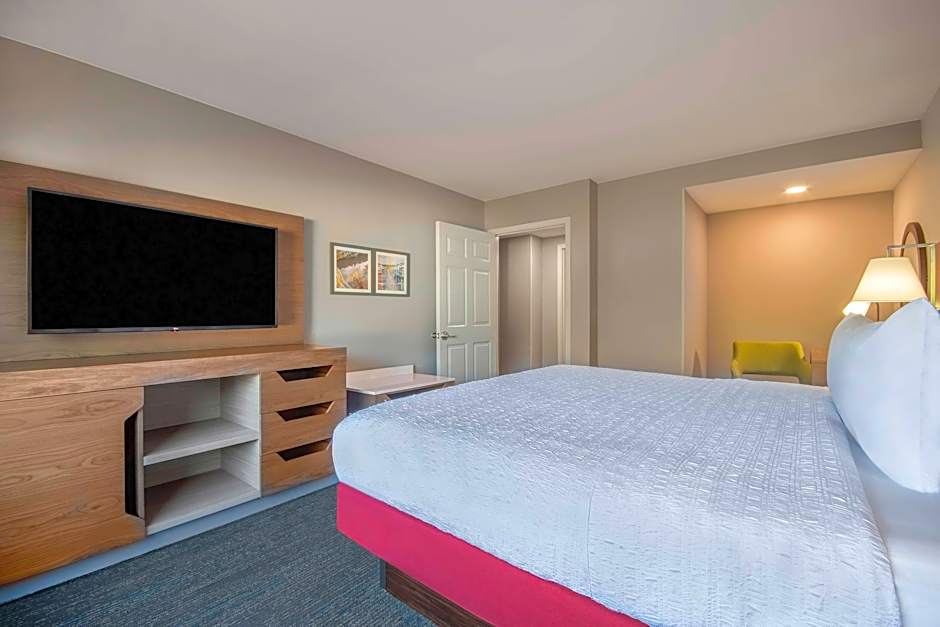 Free WiFi, whirlpool tub, separate seating area, work desk and chair, coffeemaker Enjoy your stay in this spacious two room non-smoking suite which features a whirlpool tub and one king-sized clean and fresh Hampton bed®. Relax on the sofa and watch a movie on the 25-inch HDTV or catch up on work at the desk and stay connected with free WiFi access. Enjoy the convenience of having a coffeemaker in your suite. The stylish bathroom with plush towels provides a shower with WaterPik® showerhead and curved shower rod for extra space and light.