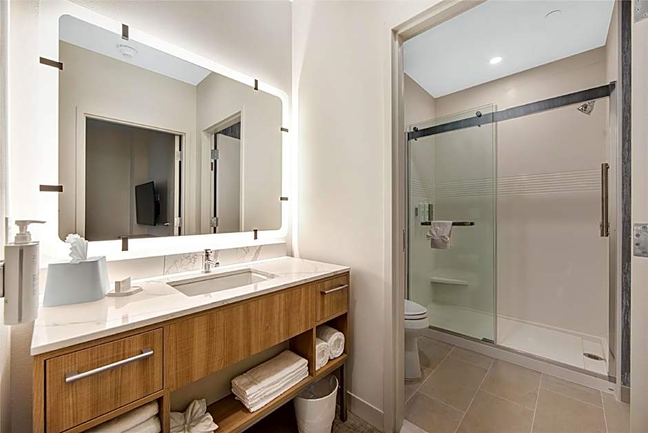 The location is close to shops, restaurants and the American Dream Mall. The staff are all personable and make the stay very comfortable. The pool is a good size and not too deep if you have little kids and for older kids there's a basketball hoop/court outside of the dining room space. The dining area is large enough that I never had an issue finding seating for breakfast and there were plenty of options for myself and the family to enjoy. The one bedroom suites have a full kitchen and living space to give separation if your kids go to bed early. But the bathroom is within the room so be prepared to hold it or tip toe. The room was cleaned and we'll stocked and the common areas including the pool were clean. We will be back again.