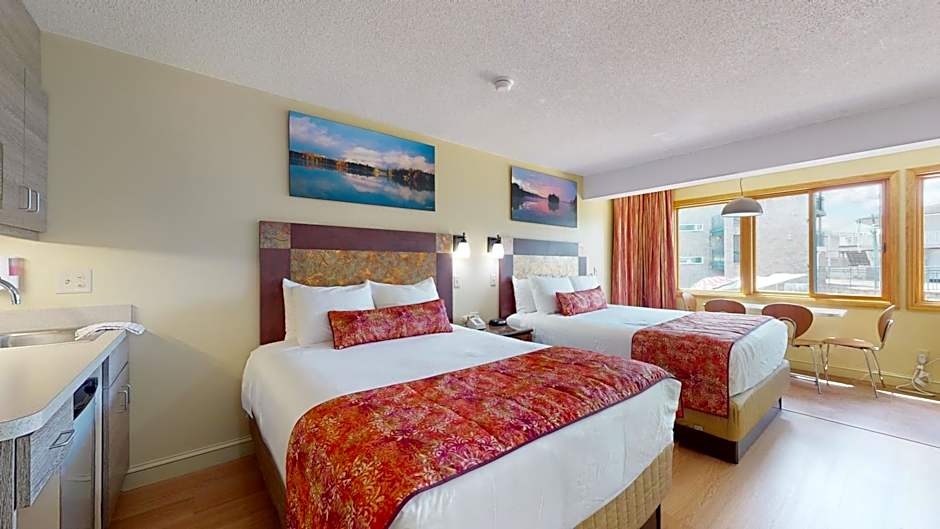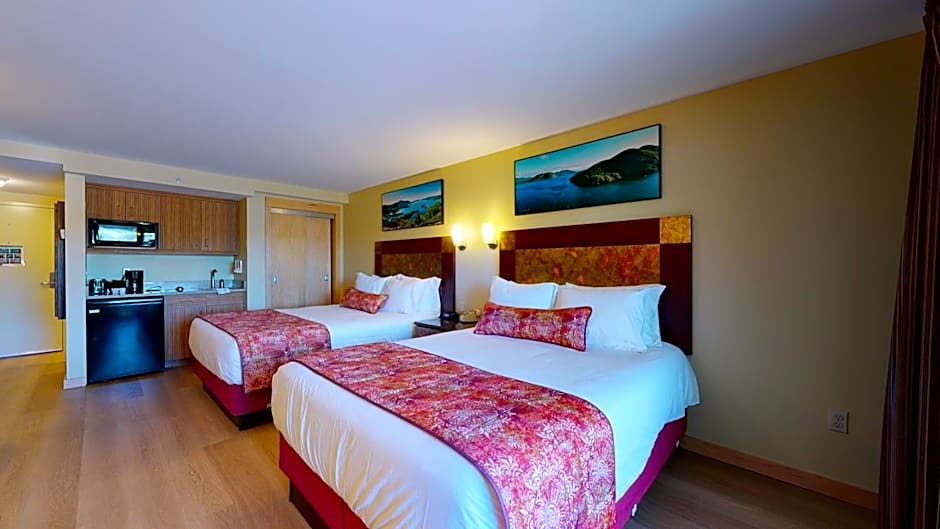 This room has 2 queen beds, flat-screen TV, climate control, 10-foot granite table, bathroom with tub/shower, a kitchenette with a small refrigerator, wet bar sink and microwave, hair dryer, iron and ironing board.