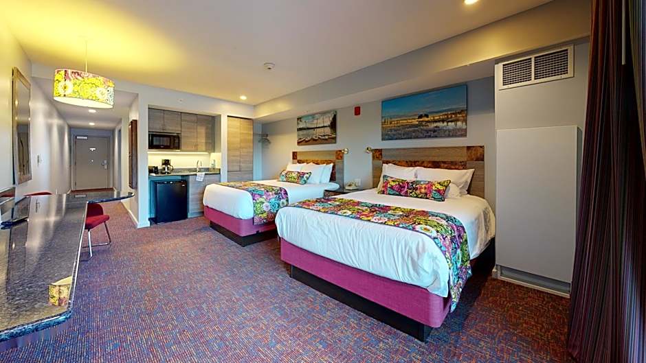 This room comes with 2 queen beds, flat-screen TV, climate control, 10-foot granite table, bathroom with tub/shower, a kitchenette with a small refrigerator, wet bar sink and microwave, hair dryer, iron and ironing board.