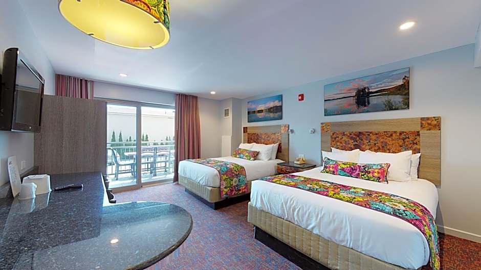 This room has 2 queen beds, flat-screen TV, climate control, granite table, private balcony with a table and 4 chairs, a bathroom with a tub/shower, under-counter refrigerator, wet bar sink, toaster, microwave, dinnerware and utensils.
