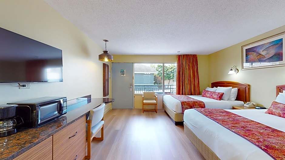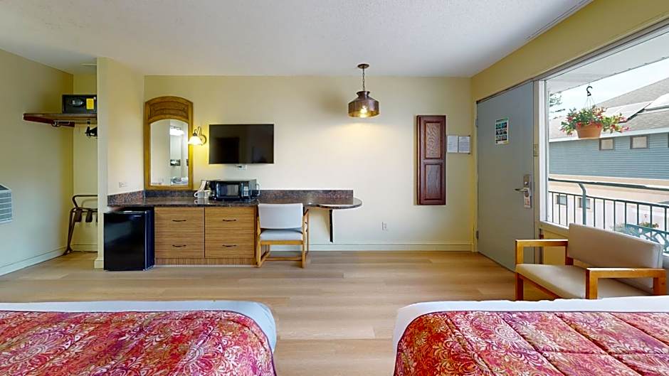 This room comes with 2 queen beds, flat-screen TV, climate control, 10-foot granite table, bathroom with bath/shower, small refrigerator, microwave, hair dryer, iron and ironing board.