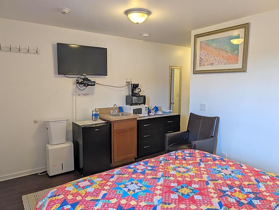 The motel exceeded our expectations, Room was immaculate and very clean. They provide a microwave, mini fridge, free Wi-Fi, kitchen utensils, plenty of clean towels. They also provided dish soap, body wash, shampoo, hand soap and an iron. It is a family run business, Paul is the owner who also conveniently owns the convenience store gas station in front of the motel. The each room has a front and read door, the rear door faces an enormous corn field and mountain views, they provide 2 chairs and a table to enjoy your morning coffee. THEY only negative is the air is filled with the smell of the dairy farm down the road, you get used to it. Brings you closer to the mountains!