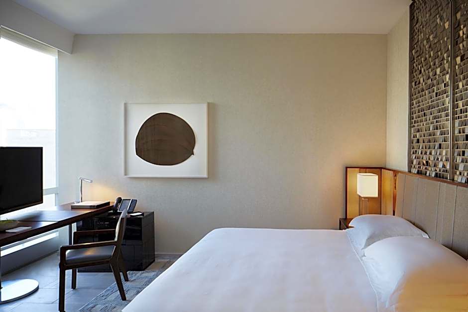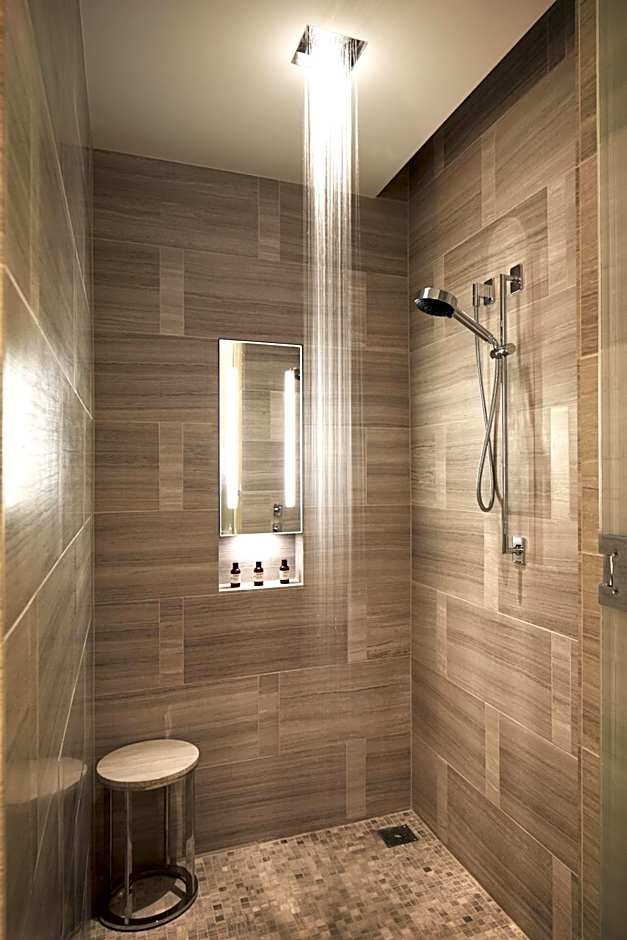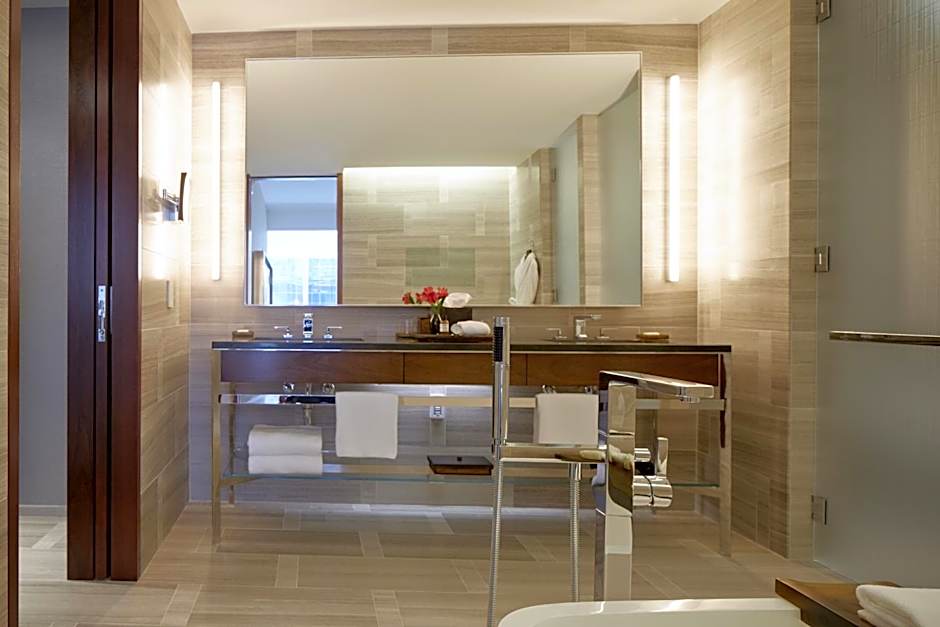 This room has natural stone flooring and an area rug. It is adorned with artwork. The king bed is covered with Italian linens. The room also offers views of the city and features floor-to-ceiling windows. A walk-in rain shower, signature Le Labo products and a soaking tub await in the five-fixture bathroom. WiFi and an integrated media hub is also provided.