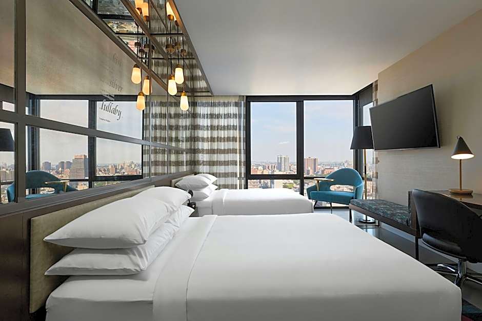 The Renaissance New York Harlem Hotel offers rooms with different bed sizes and views. The Queen Rooms have two queen beds and can accommodate up to 4 adults and 3 children. The King Rooms have a king-sized bed and can accommodate 2 adults and 1 child. All rooms are non-smoking. Some rooms offer views of the city or Central Park.