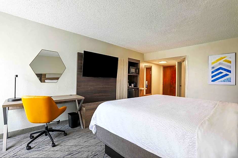The hotel offers a Queen Room with Roll-In Shower and a Queen Room with Bath Tub, both with disability access and non-smoking. These rooms accommodate 2 adults and 1 child with a Queen size bed. There is also a King Room available, which accommodates the same number of guests with a King size bed. Additionally, the hotel provides a Queen Room with Two Queen Beds, accommodating 4 adults and 3 children. The Room Selected at Check-In option offers 2 Queen size beds in a non-smoking room.