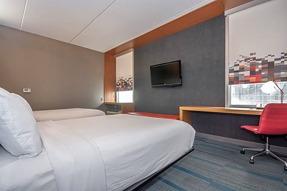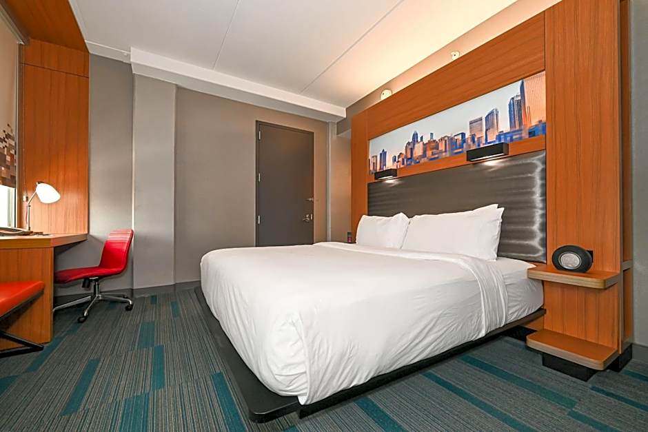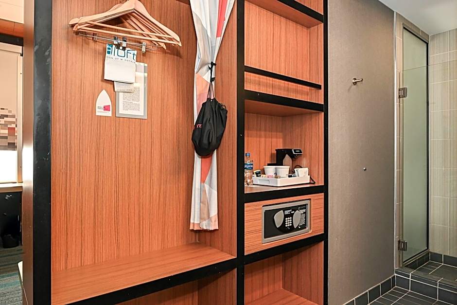 The hotel offers Queen Rooms with Two Queen Beds and Roll-in Shower, Aloft Guest Rooms with 1 King bed, and Aloft Larger Guest Rooms with 1 King bed and EpiCentre view. They also have Aloft Guest Rooms with 2 Queen beds and EpiCentre view, as well as King Rooms with Roll-in Shower. All rooms are non-smoking and have a size of either 280 sqft or 312 sqft. Each room type can accommodate 2 adults and 1 child.