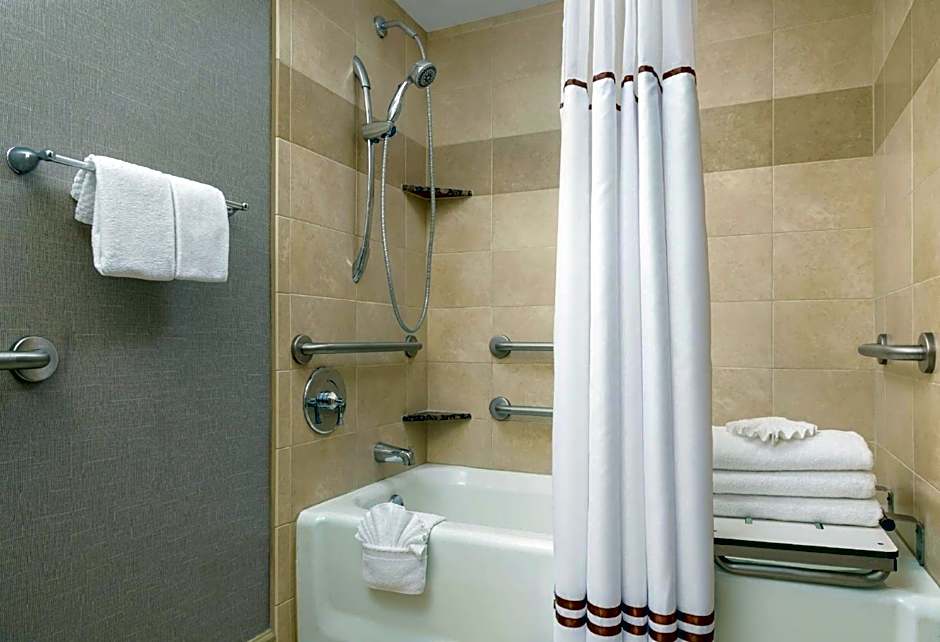 This king room is hearing and mobility accessible. It includes a roll-in shower.
