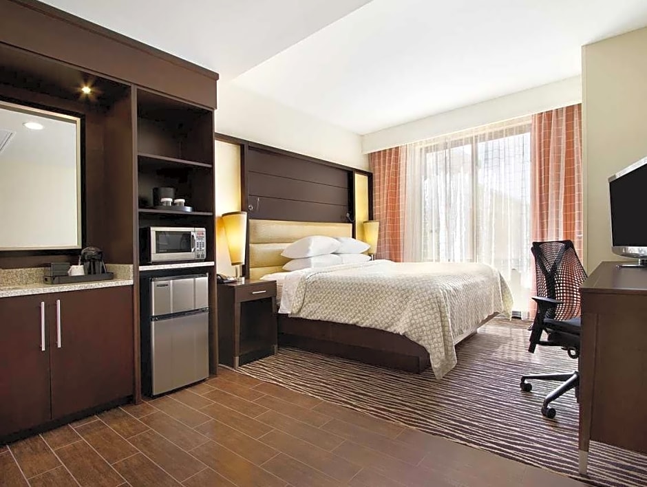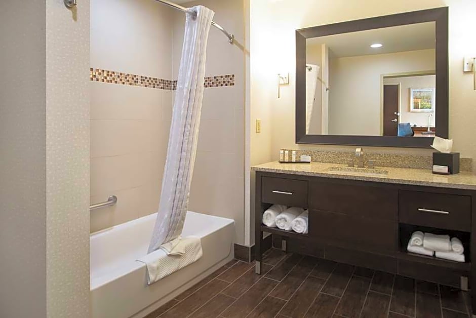 Enjoy this spacious and warmly decorated two-room suite offering a separate bedroom and living room in a modern transitional style with all of the comforts of home. The living room features a granite-top wet bar with mini-refrigerator and microwave, a flexible work area with multi-task desk/table with ergonomic chair, wired and WiFi access, a "stretch out and relax" living area with sofa bed and 42-inch flat-screen HDTV. The bedroom features our "Presidential Suite Plush" king-sized bed topped with Embassy Essentials high thread count bedding, alarm clock with MP3 plug-in, with a second 42-inch flat-screen HDTV and opens to a spacious bathroom with granite-top vanity and trend setting designed sink arranged with invigorating bath amenities. Bring on the morning with our complimentary cooked-to-order breakfast and be prepared to unwind and relax at our Evening Reception. Any corresponding photo may not reflect the specific accessible room type or room feature.