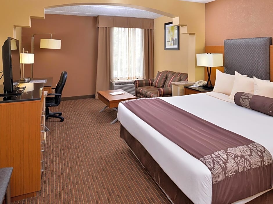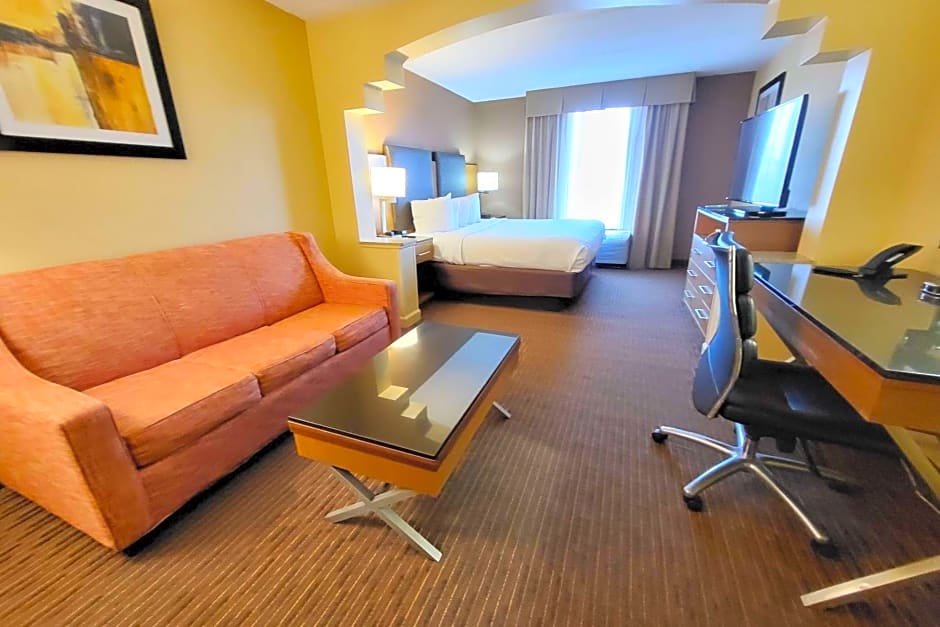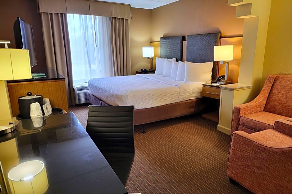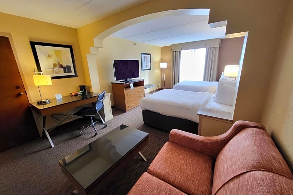 The Wingate by Wyndham Greensboro-Coliseum offers a variety of suite options, including a suite with two double beds, a king suite with mobility access and a bathtub with grab bars, a king suite with a sofa bed, and a king suite with mobility access and a roll-in shower. All rooms are non-smoking and accommodate either 2 adults and 1 child or 4 adults and 3 children. Bed sizes range from double beds to king-size beds.