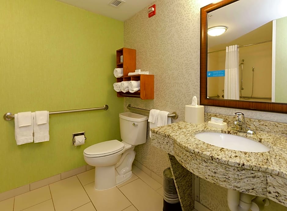 Any corresponding photo may not reflect the specific accessible room type or room feature. This mobility and hearing accessible, one-room, nonsmoking studio suite features one king sized bed , and an accessible roll-in shower. The suite also has a visual alarm and notification devices for the doorbell or door knock and incoming phone calls. The room features include a microwave, refrigerator, wet bar, comfortable soft seating, a HDTV, and easy to operate alarm clock/radio. The free high speed internet access will help you stay connected while on the road. If you prefer not to work at the desk, you can use the convenient lapdesk instead. You'll also enjoy the convenience of having a coffee maker with tea service and iron/ironing board in your room.