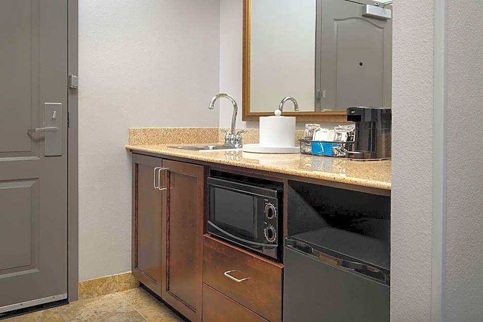 This spacious suite features a large seating area with a sofa bed and a work desk; a microwave and mini-fridge are included.