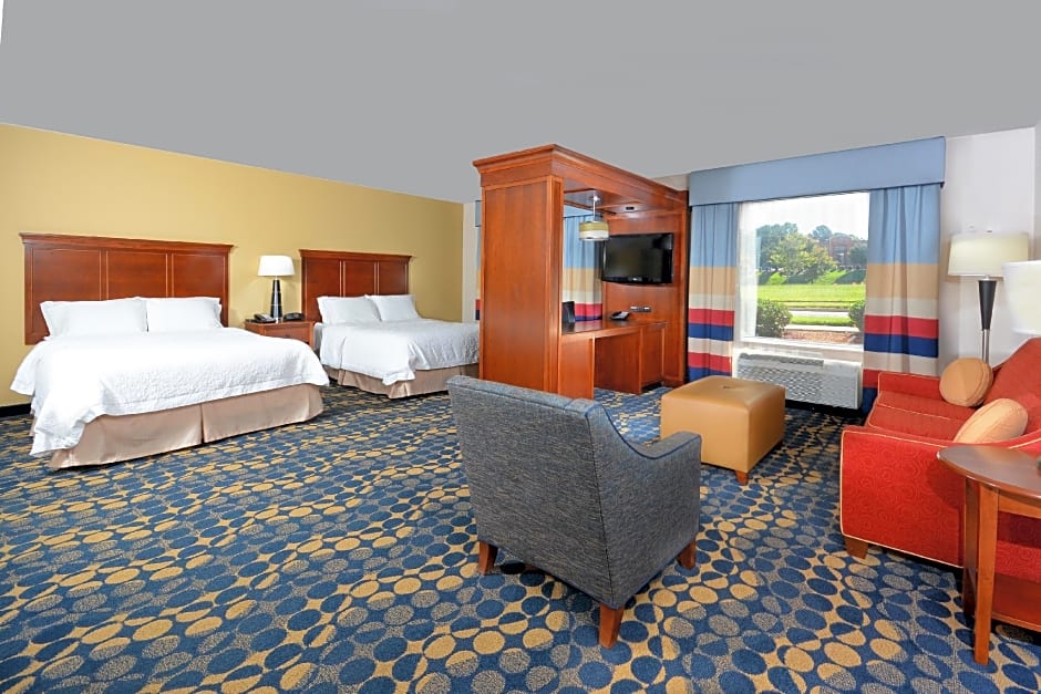 The rooms available at Hampton Inn & Suites Huntersville include King Suites, Queen Suites, King Rooms, and Queen Rooms with varying occupancy capacities. Smoking is not allowed in any of the rooms. The bed sizes offered are King size bed and Queen size beds. The room sizes range from 301 sqft to 323 sqft.