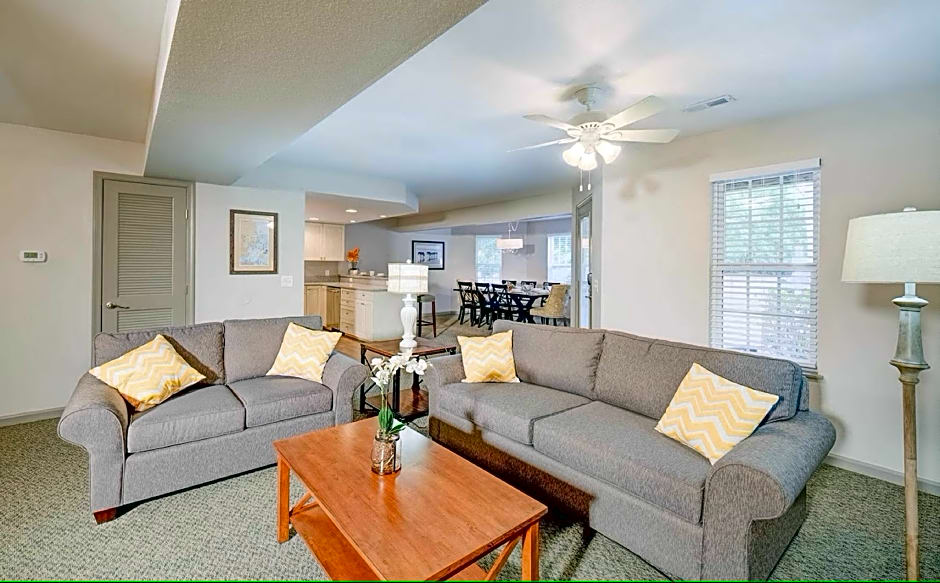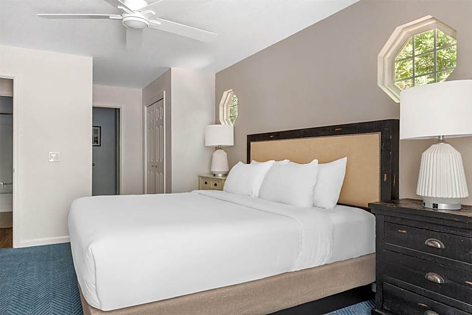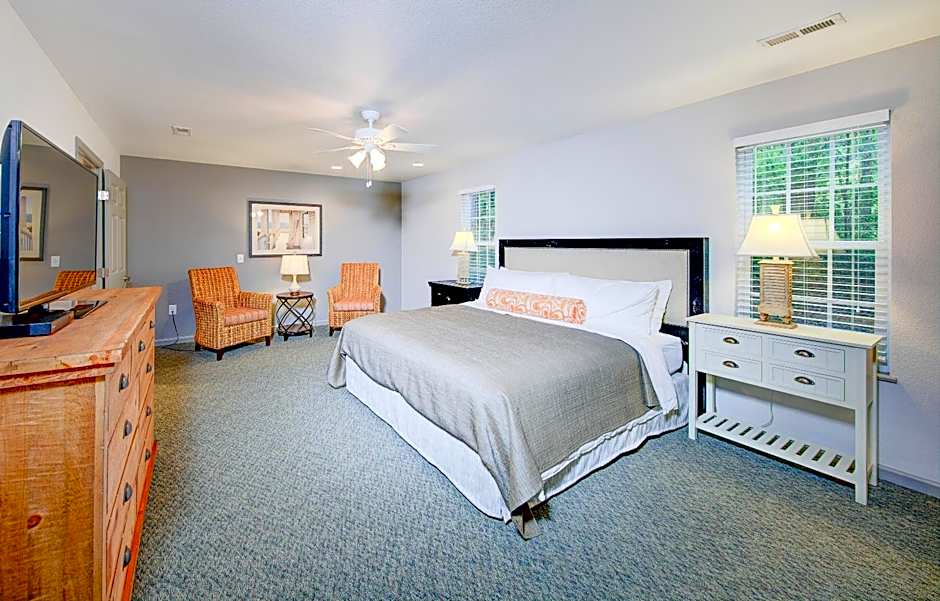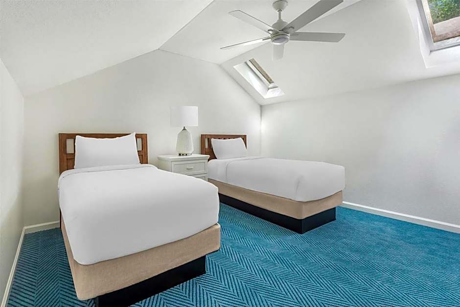 This suite features a plush king sized bed in master bedroom and a loft area with two twin beds. Enjoy a fully-equipped kitchen that provides all of comforts of a home and the convenience to make a meal. The entire family can enjoy this beautiful suite offering a separate living room with a 42’’ HD TV and DVD player. Suite also has a furnished patio. Can accommodate up to 6 guests.