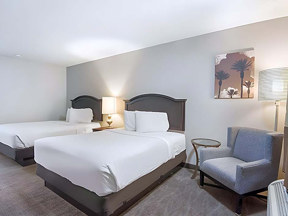 Room options include configurations with two queen beds or a king bed, with some rooms permitting smoking and others available as non-smoking for a comfortable stay.