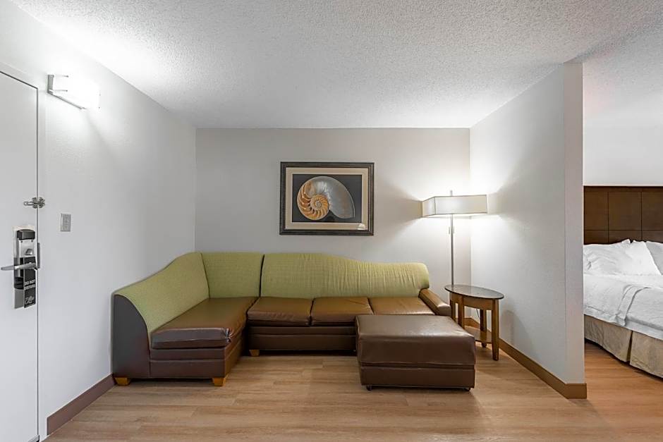 Any corresponding photo may not reflect the specific accessible room type or room feature. This hearing accessible, nonsmoking one room studio suite features one king sized bed(s). The room also has a visual alarm and notification devices for the doorbell or door knock and incoming phone calls. The room features our luxurious Clean and Fresh Hampton Bed, comfortable sofabed, microwave, refrigerator, wet bar, a HDTV, and easy to operate alarm clock/radio. In the bath you will enjoy a WaterPik shower head and curved shower rod. The free high speed internet access will help you stay connected while on the road. If you prefer not to work at the desk, you can use the convenient lapdesk instead. You'll also enjoy the convenience of having a coffee maker with tea service and iron/ironing board in your room.