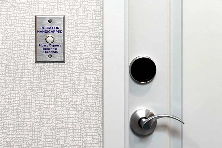 This accessible room features a microwave, small refrigerator, and visual alarm and notification devices.