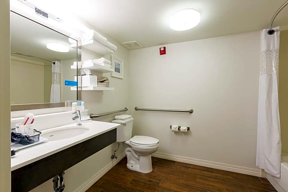 Any corresponding photo may not reflect the specific accessible room type or room feature. This mobility and hearing accessible, nonsmoking room features one king sized bed , and an accessible bath tub. The room also has a visual alarm and notification devices for the doorbell or door knock and incoming phone calls. The room features comfortable soft seating, microwave, refrigerator, a HDTV, and easy to operate alarm clock/radio. The free high speed internet access will help you stay connected while on the road. If you prefer not to work at the desk, you can use the convenient lap desk instead. You'll also enjoy the convenience of having a coffee maker with tea service and iron/ironing board in your room.