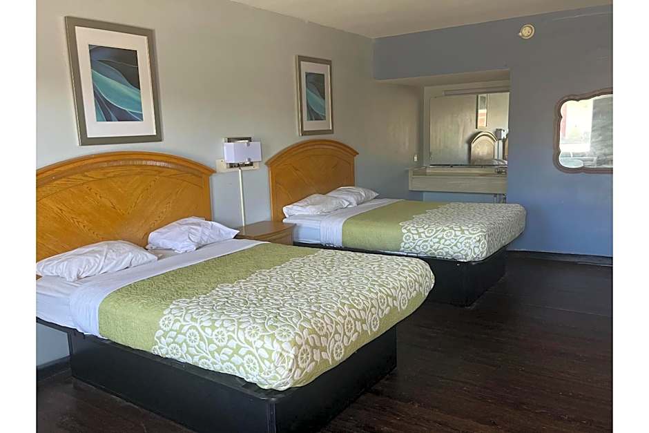 Room options include a King Room with a kitchenette (non-smoking, about 151 sq ft, one king bed) for a cozy, self-contained stay. Additional configurations feature two double beds in both non-smoking and smoking options, plus larger 2 Full/2 Double layouts, with some smoking allowed.