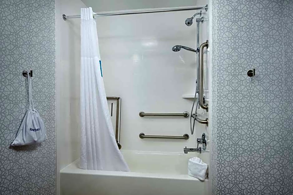 This mobility accessible, non-smoking room features one king-sized bed, and an accessible bath tub. The room features a refrigerator, HDTV, and easy to operate alarm clock/radio. The free WiFi access will help you stay connected while on the road. If you prefer not to work at the desk, you can use the convenient lapdesk instead. You'll also enjoy the convenience of having a coffeemaker with tea service and iron/ironing board in your room. Any corresponding photo may not reflect the specific accessible room type or room feature.