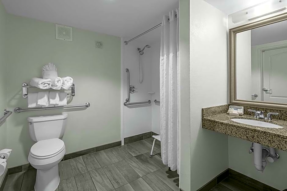 This mobility accessible standard one bedroom suite features one king-sized bed, and a roll-in shower. Roll-in shower with attached accessible seating, lowered vanity in bathroom, and lowered closet shelf. The pursuit of the perfect night's stay continues with new amenities including the bed, chair and television. The ergonomic Mirra chair by Herman Miller is good for your back and better for work. Enjoy your favorite television show on our 36-inch HDTV. There's also a microwave, refrigerator and coffee/tea maker to help you feel at home. A separate living area with a full-sized sofa bed, coffee table and TV. And for conducting business, our rooms ensure your productivity thanks to the complimentary WiFi access, two telephones with dataport and voice mail, and electrical outlets at desk height. Any corresponding photo may not reflect the specific accessible room type or room feature.