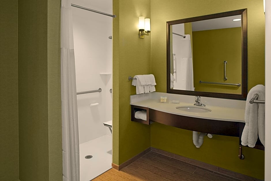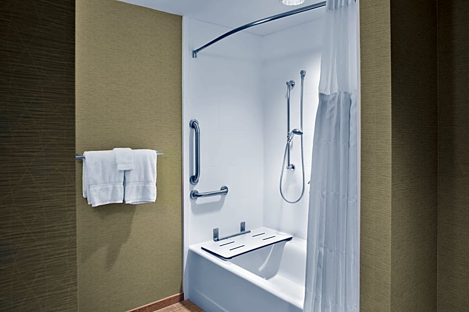 This mobility accessible deluxe room features one king-sized bed, and a roll-in shower. This room offers the latest in technology and ergonomic comfort to our guests. Roll-in shower with attached accessible seating, lowered vanity in bathroom, and lowered shelf in closet. The ergonomic desk chair is good for your back and better for work. Enjoy your favorite television show on our 42-inch HDTV. There's also a microwave, refrigerator and Keurig coffeemaker to help you feel at home. Any corresponding photo may not reflect the specific accessible room type or room feature.