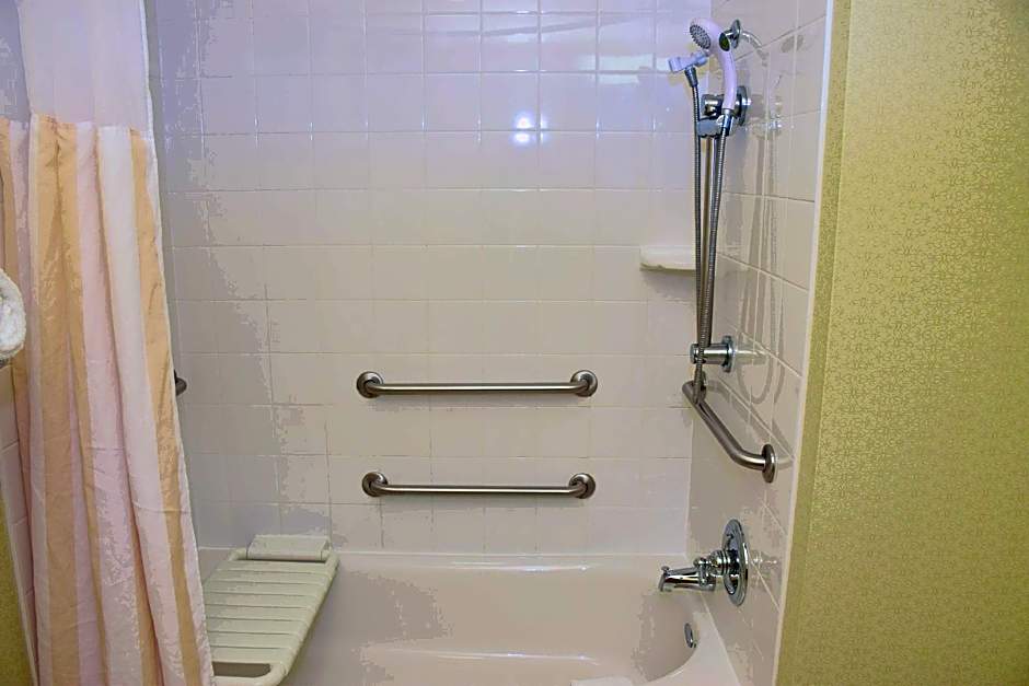 This mobility and hearing accessible deluxe room features two queen-sized beds, and an accessible tub. The room also has a visual alarm, and notification devices for the doorbell or door knock and incoming telephone calls. Grab bar in tub with attached accessible seating, lowered vanity in bathroom, and lowered closet shelf. The ergonomic Mirra chair by Herman Miller is good for your back and better for work. Enjoy your favorite television show on our 36-inch HDTV. There's also a microwave, refrigerator and coffee/tea maker to help you feel at home. And for conducting business, our rooms ensure your productivity thanks to the spacious work desk, two telephones with dataport and voicemail and complimentary wired and wireless high-speed internet access. Any corresponding photo may not reflect the specific accessible room type or room feature.