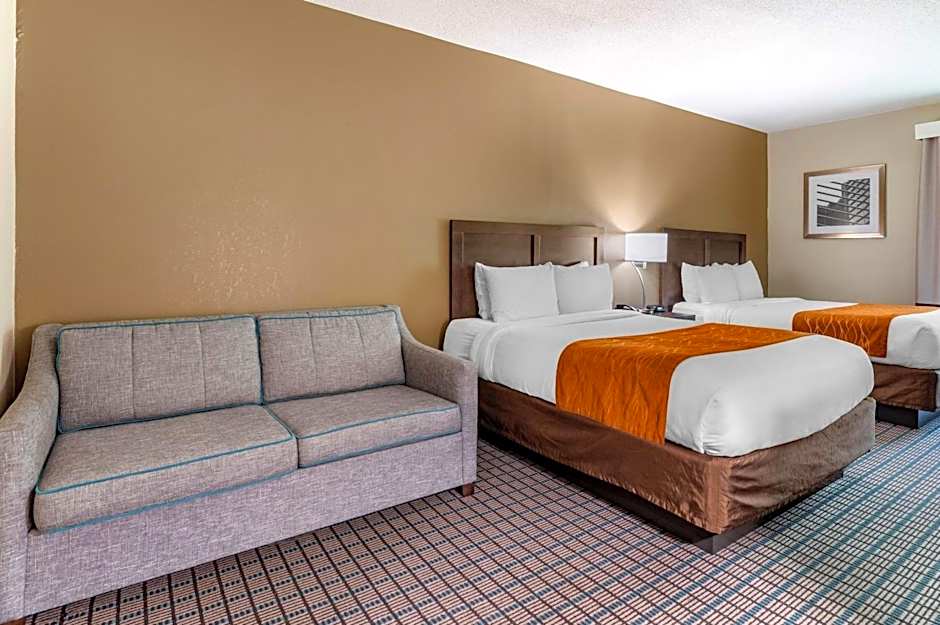 The Comfort Inn & Suites hotel offers rooms in various types, including Efficiency Queen Suite, King Room, Queen Room with Two Queen Beds, and King Suite. All rooms have a size of 355 sqft and are non-smoking. The occupancy ranges from 2 adults and 1 child to 5 adults and 4 children, depending on the room type. The bed sizes include Queen, King, and Sofa Bed.