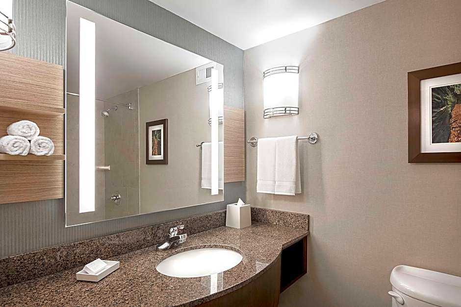 This hearing accessible one bedroom suite features two queen-sized beds. The room also has a visual alarm, and notification devices for the doorbell or door knock and incoming telephone calls. And the pursuit of the perfect night's stay continues with an evolution of innovative new amenities including the bed, chair and television. The ergonomic chair is good for your back and better for work. Enjoy your favorite television show on our 36-inch HDTV. There's also a microwave, refrigerator and coffee/tea maker to help you feel at home. A separate living area with a full-sized sofa bed, coffee table and TV. For conducting business, our rooms ensure your productivity thanks to the spacious work desk, two telephones with dataport and voicemail and complimentary WiFi.