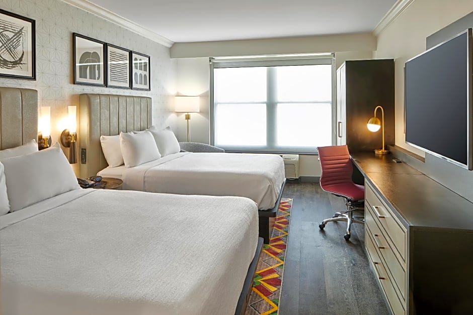 The Hotel Indigo Cleveland Downtown offers a variety of room types including King Rooms with Sofa Bed, King Rooms with Mobility Accessible Tub, Deluxe King Rooms, Standard Two Queen Beds, Standard Two Queens or One King Rooms, Standard King Rooms, King Rooms with Mobility Accessible Roll-In Shower, Deluxe Two Queen Beds, Standard Queen Room with Two Queen Beds and Mobility Accessible Tub, and One-Bedroom King Suites. None of the rooms allow smoking. The room sizes range from 355 sqft to 495 sqft. The occupancy of the rooms varies from accommodating 2 adults and 1 child to 4 adults and 3 children. The beds available include King size beds, Queen size beds, and Sofa beds.