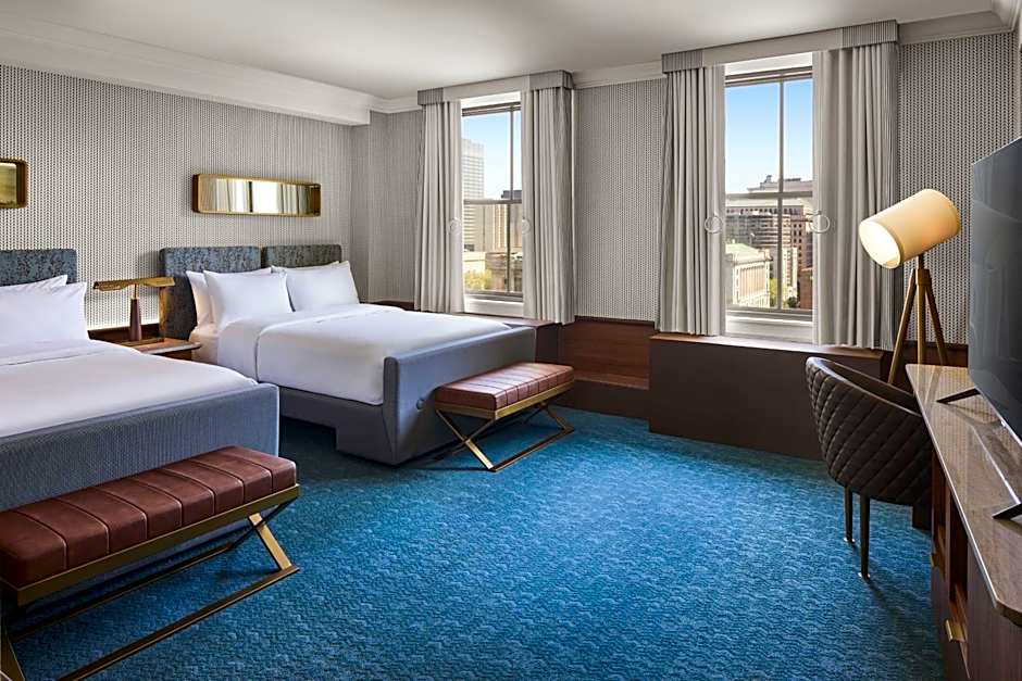 The hotel offers a variety of rooms including Deluxe Rooms with either One King Bed or Two Queen Beds overlooking the Public Square. These rooms are non-smoking and can accommodate up to four adults. Each room is equipped with either a King size bed or two Queen size beds. Additionally, there is a Deluxe Room available with One Queen Bed, which can accommodate up to two adults. These rooms are also non-smoking.