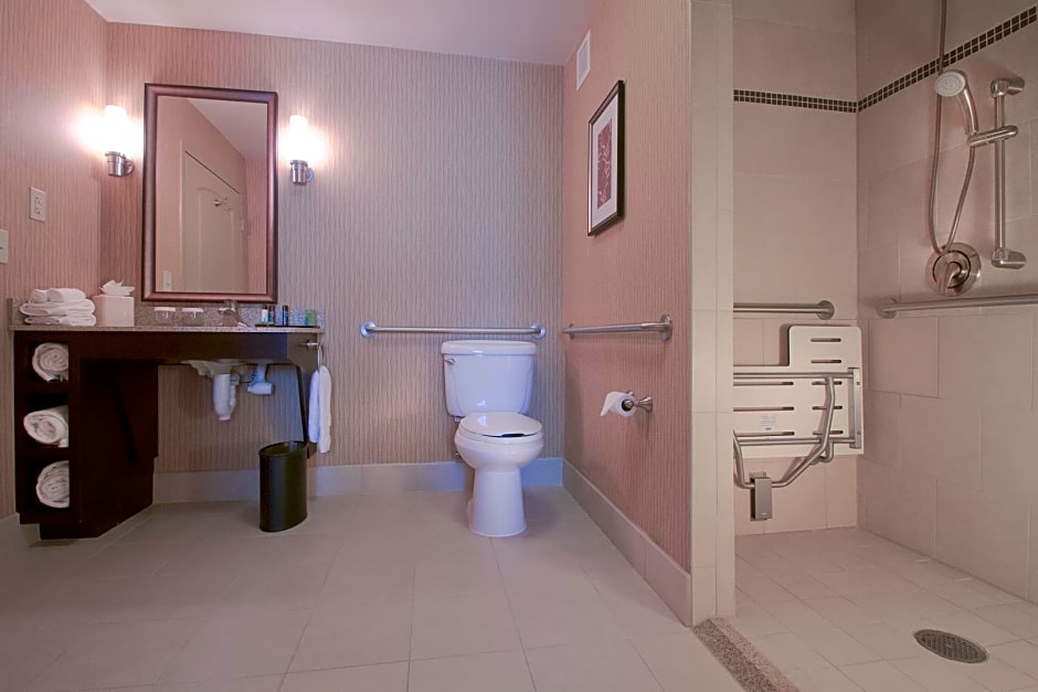 This mobility accessible standard suite features one queen-sized bed, and a roll-in shower. Spacious two-room, non-smoking suite includes a Suite Dream bed along with a separate living room that features a queen-sized sofa bed, comfortable sitting area with parlor chair, 42-inch HDTV, wet bar with refrigerator, microwave and coffeemaker. The bedroom, along with the one queen-sized bed offers a well-lit vanity and sink, armoire with a 42-inch HDTV and our signature alarm clock. WiFi and wired internet access is available for a nominal fee. Any corresponding photo may not reflect the specific accessible room type or room feature.