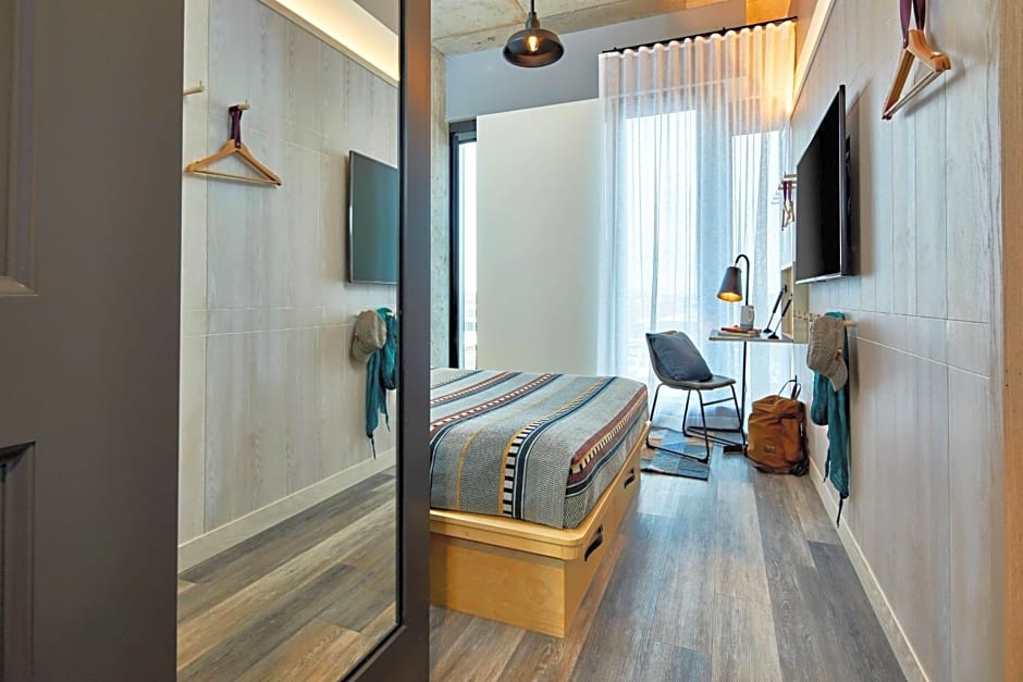 This is a cool hotel with a youthful look and feel. It's energetic, interesting, and a world away from the staid chain hotels that are so often on offer. While the rooms are small, they offer everything you need. There are multiple areas outside of the room to hang out and socialize (a bar/ cafe area, 6th floor terrace) which creates a good community feel. The free beverage choice on arrival is a nice touch, as is the light breakfast and coffee available in the morning!