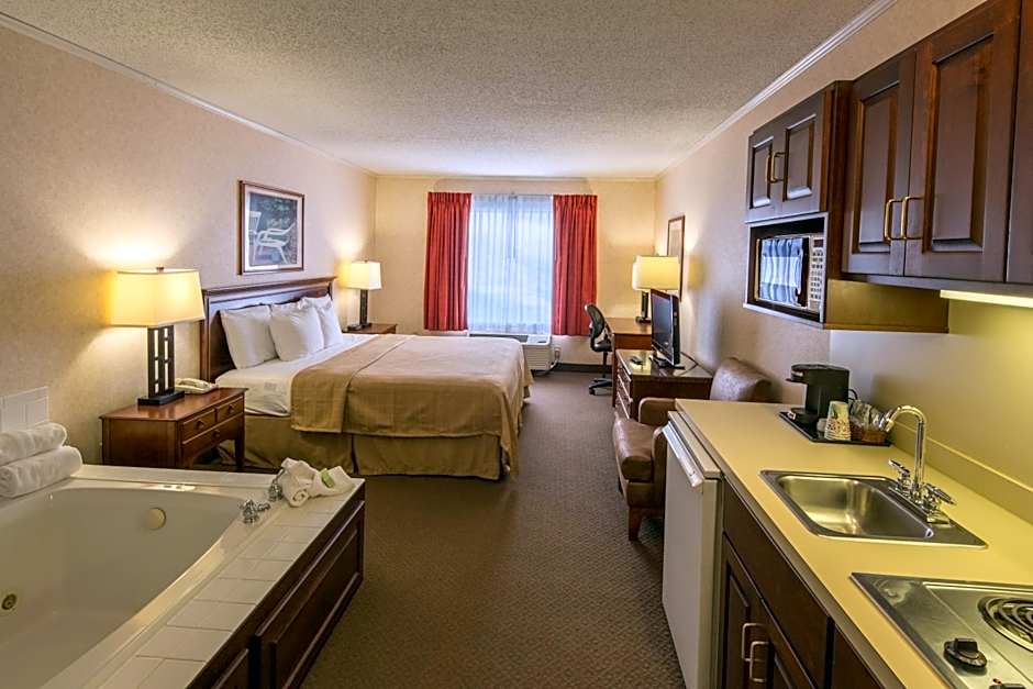 This suite's standout features are the hot tub and spa bath. Boasting a private entrance, this spacious suite also includes 1 bedroom, a seating area and 1 bathroom with a walk-in shower and a hairdryer. Meals can be prepared in the kitchenette, which is fitted with a stovetop, a refrigerator, a microwave and a toaster. The air-conditioned suite offers a flat-screen TV with cable channels, a tea and coffee maker, a carpeted floor and heating. The unit has 1 bed.