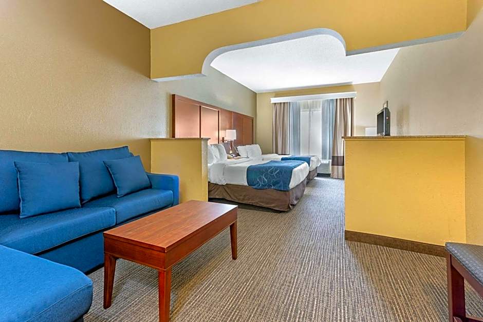 The Comfort Suites Findlay I-75 hotel offers three types of suite rooms. The King Suite with Sofa Bed has a room size of 215 sqft and can accommodate 3 adults and 3 children. The King Suite with Sofa Bed and Hot Tub also has a room size of 215 sqft and can accommodate 2 adults and 1 child. The Queen Suite with Two Queen Beds and Sofa Bed is slightly larger at 258 sqft and can accommodate 5 adults and 4 children. All rooms are non-smoking.