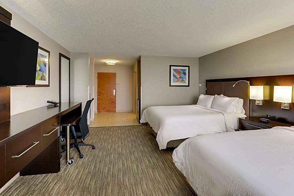 The Holiday Inn Express Hotel & Suites Bryan-Montpelier offers various room types including Queen Rooms with Two Queen Beds, Standard King Rooms with Jetted Tubs, Double Rooms with Two Beds (Mobility Accessible), Queen Suites, King Suites (Mobility Accessible), and Deluxe Suites. Smoking is not allowed in any of the rooms. The rooms accommodate between 2-6 adults and 1-4 children, with bed sizes including Queen, King, Double, and Sofa Bed options. Room sizes range from 323 to 334 sqft.