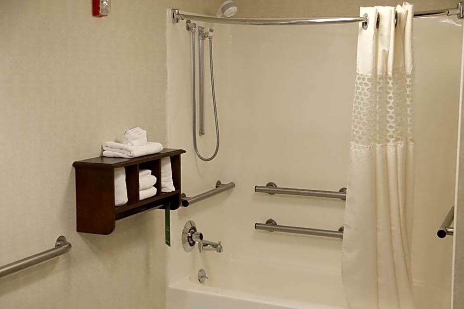 This mobility and hearing accessible, non-smoking room features one king-sized bed, and an accessible bath tub. The room also has a visual alarm and notification devices for the doorbell or door knock and incoming phone calls. The room features comfortable soft seating, refrigerator, a HDTV, and easy to operate alarm clock/radio. The free WiFi will help you stay connected while on the road. If you prefer not to work at the desk, you can use the convenient lapdesk instead. You'll also enjoy the convenience of having a coffeemaker with tea service and iron/ironing board in your room. Any corresponding photo may not reflect the specific accessible room type or room feature.