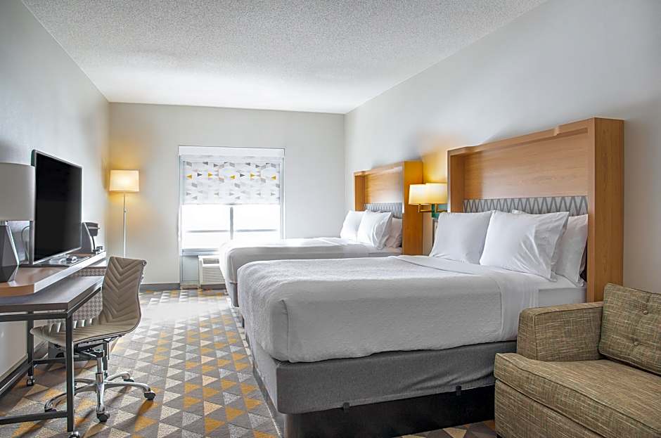The Holiday Inn Toledo - Maumee I-80/90 offers a variety of room types including Deluxe Queen Rooms with Two Queen Beds, Queen Rooms with Two Queen Beds (including one designed for individuals with hearing impairments and a roll-in shower), King Rooms with Disability Access and a roll-in shower, and King Rooms with a sofa bed. All rooms are non-smoking and accommodate 4 adults. Bed sizes include queen and king beds, with some rooms also featuring a sofa bed.