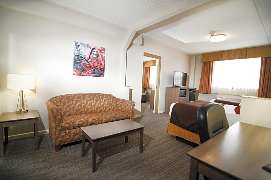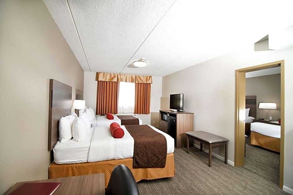 The hotel offers several types of suites. These include two-room suites with four double beds, two-room suites with three double beds, a double suite with two double beds, and king suites with either a roll-in shower or a bathtub. All suites are non-smoking and have different occupancy capacities. The two-room suites can accommodate up to 6 adults and 4 children, while the double suite and king suites can accommodate up to 4 adults and 3 children or 2 adults and 1 child, respectively.